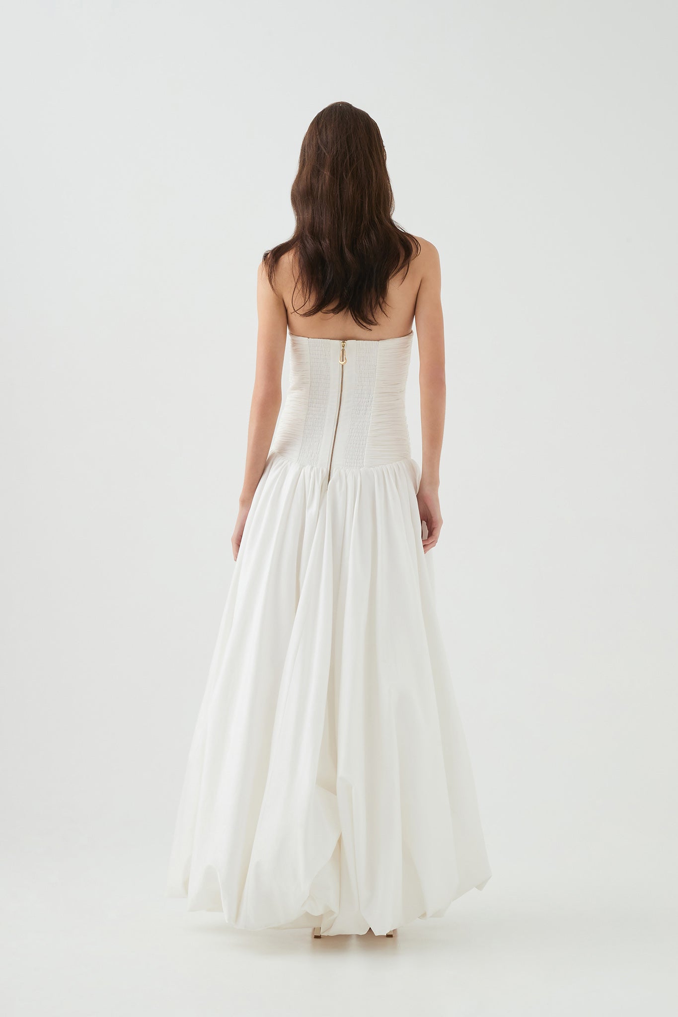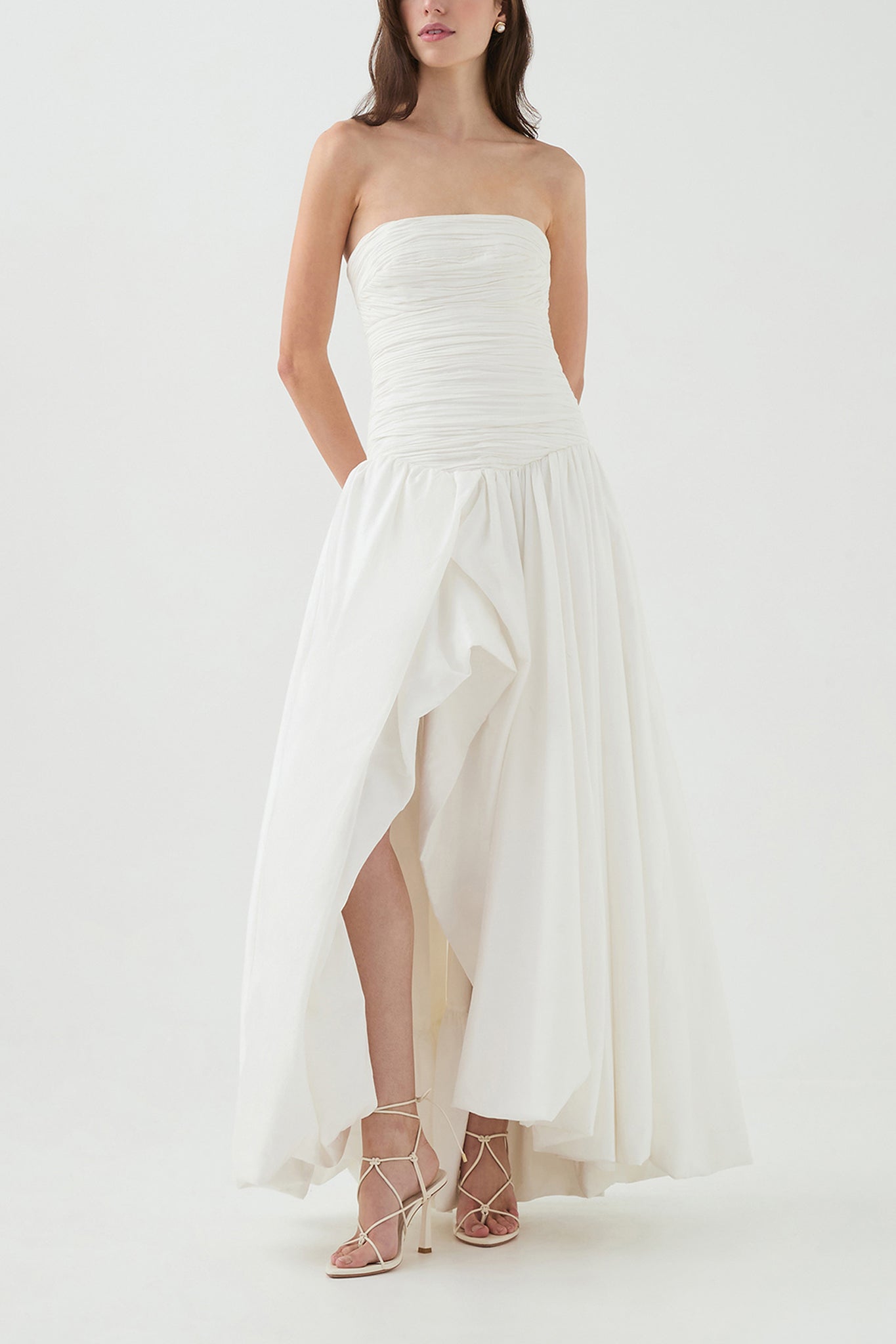• Fitted through the bust and waist before falling into a voluminous, draped skirt with an asymmetrical bubble hem