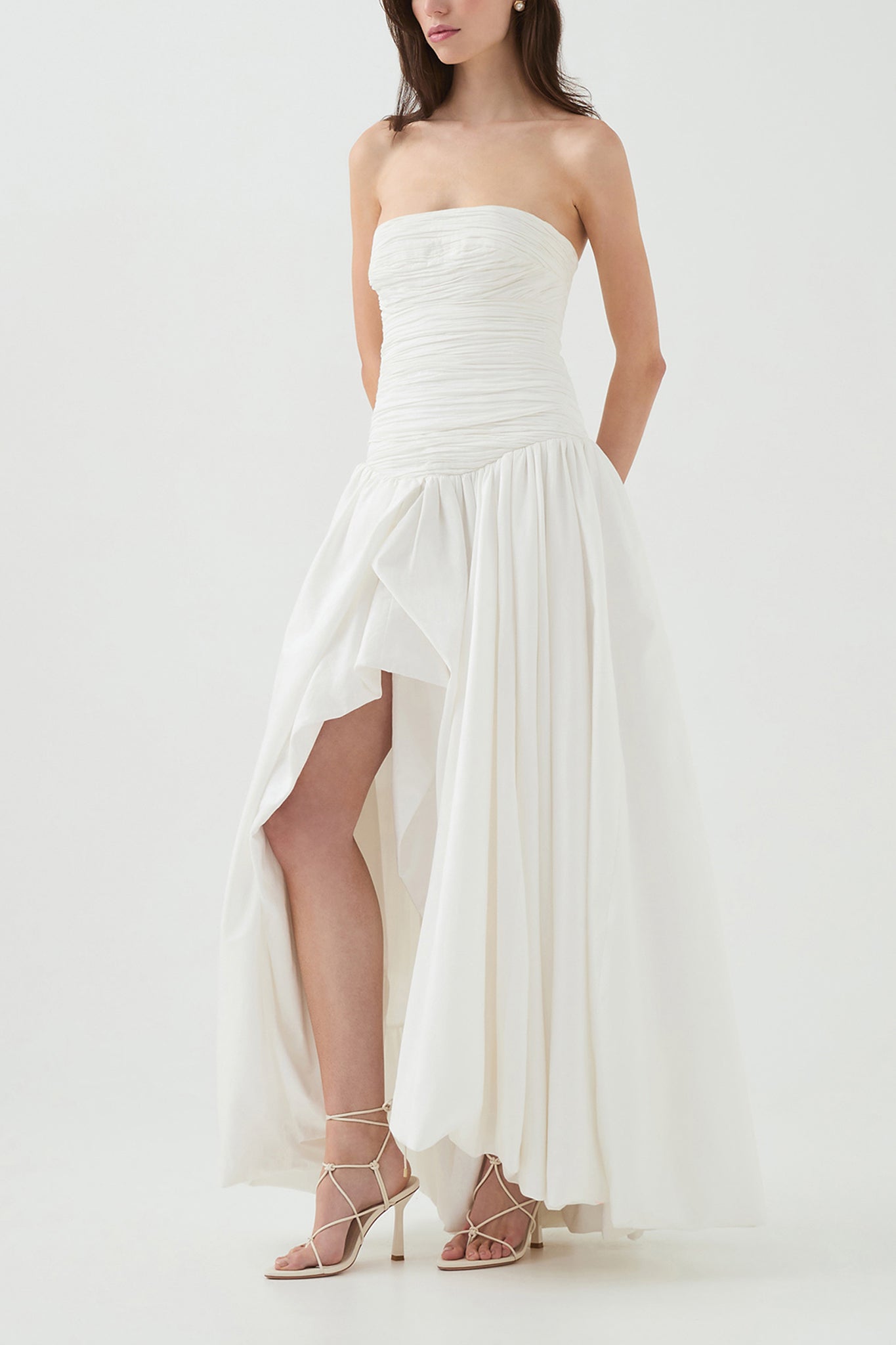 • Sculpted, strapless bodice with ruched detailing and internal support