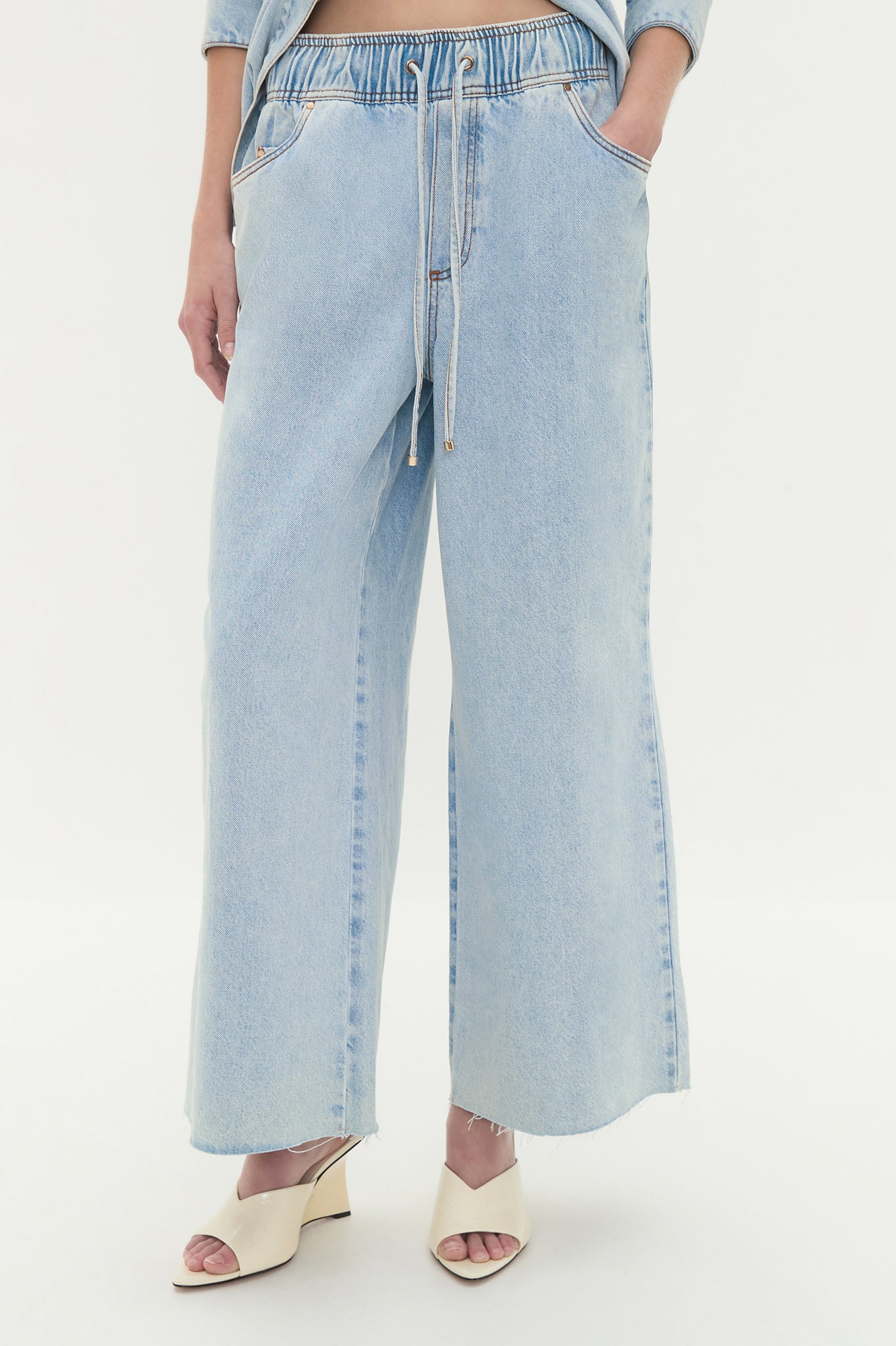 • Wide elasticated waistband with gold tipped drawcords