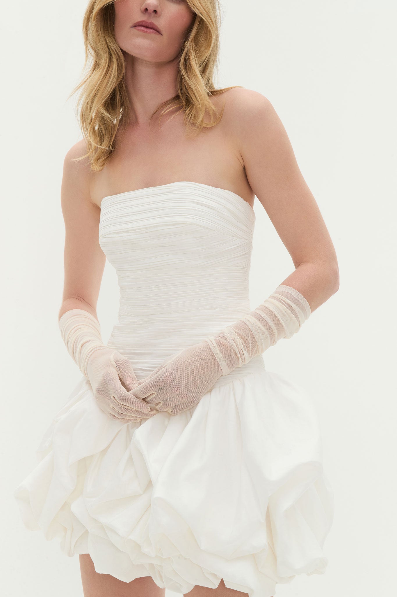 - Mini bubble‑hem skirt introduces volume and movement from the waist down